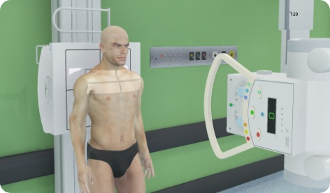 The medspace.XR patient model is highly realistic and fully adjustable. The patient places themselves in an approximate initial position that is subject to random error, reflecting the variability in real life. Positional adjustments are made by clicking on the body part and selecting the appropriate anatomical movement. Beginners can benefit from an option to visualise the patient skeleton; an ideal way to check anatomical landmark understanding. Adjustments include positioning of radio-opaque markers and fully adjustable cassette holders are made before imaging.